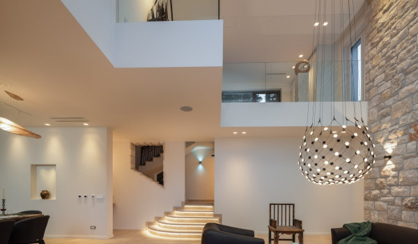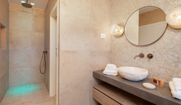 Из каменного двора можно попасть в просторный первый этаж, окутанный солнечными лучами, оформленный в средиземноморском стиле в сочетании с камнем и современными элементами. Большая часть передней части остеклена и создает ощущение комфорта и расслабления с видом на море и горы. Современная гостиная состоит из мягкой мебели и декоративной мебели, умного телевизора, внутреннего камина и столовой с просторным столом на 8 человек. Ниже находится профессиональная полностью оборудованная кухня с посудомоечной машиной, винным хранилищем, ледогенератором, плитой, духовкой, микроволновой печью, блендером и кофеваркой. Чтобы гости могли максимально насладиться гастрономией острова, в вилле есть винный погреб на первом этаже, который не оставит равнодушными любителей вина. На первом этаже также находится оазис для расслабления, включающий сауну, современный фитнес-зал и гостевой туалет. Спа-процедуры - отличный выбор для выведения токсинов, повышения кровообращения в организме, снижения стресса и устранения головной боли, очищения дыхательных путей и избавления от токсинов в организме.