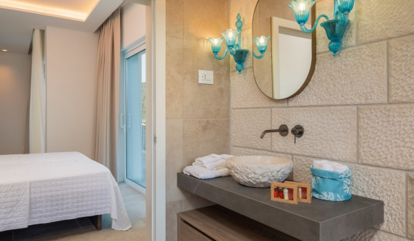 На втором этаже планировка комнат похожа, так как акцент делается на солнечном свете и виде. Здесь находятся две просторные спальни с большой открытой солнечной террасой, где есть мебель для отдыха. Внутреннее пространство комнаты выполнено в элегантном стиле, который соответствует общей атмосфере виллы, оно кондиционировано, и центральную часть комнаты занимает кровать King size размером 2х2 метра. У каждой спальни есть ванная комната с сантехническими элементами и современными санитарными узлами, такими как раковины, ванны и унитазы, зеркала с подсветкой, фены, полотенца, халаты и шампуни для гостей.
