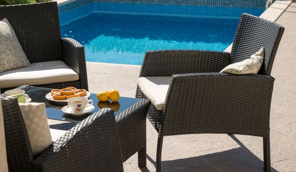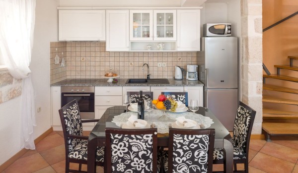 The ground floor of this luxury villa Miss O with a private pool has a fully equipped kitchen with a dining room. In the living room, there is a corner sofa and LCD SAT TV with DVD and CD player. The ground floor is connected to the first floor by a spiral staircase.