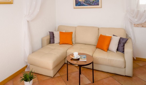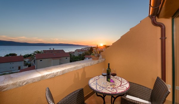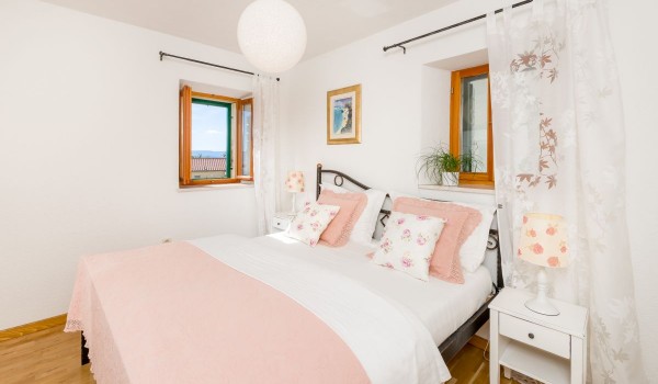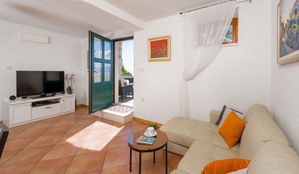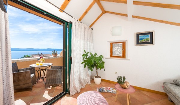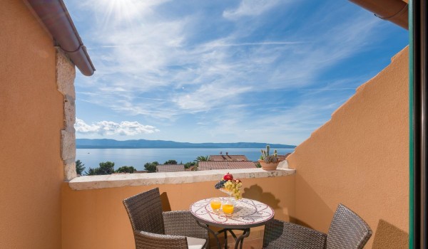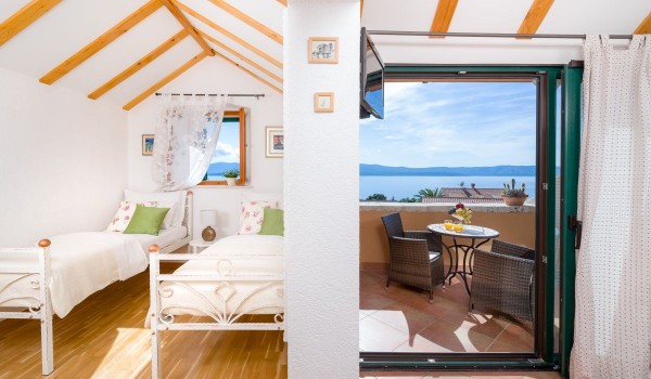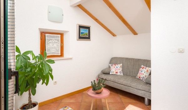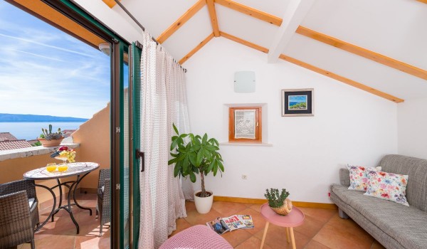Another internal staircase leads to the last, second floor of this stone beauty. On this floor, there is a studio suite, which includes a space with 2 separate beds with a bedside table, a bathroom with a shower and a separate living room with an LCD SAT TV, a coffee table and a sofa. This part of the studio is separated by a glass wall from the balcony loggia, which offers a beautiful view of the blue horizon and the island of Hvar.