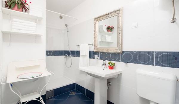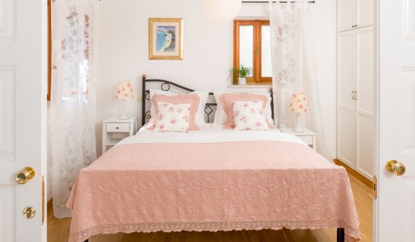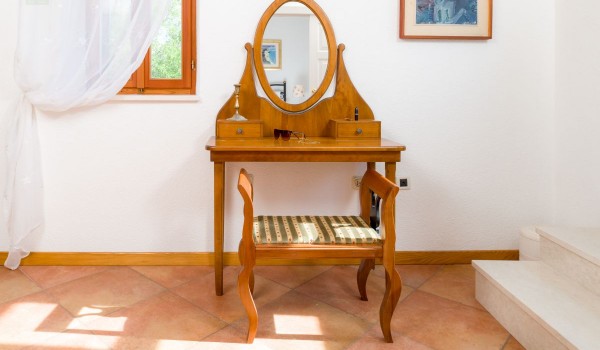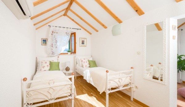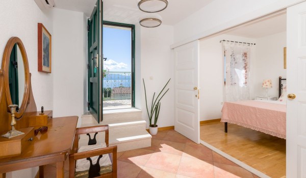 The first floor of this Croatian luxury villa with private boat mooring can also be reached by an external stone staircase. The staircase continues to a small, sun-drenched terrace that leads us into the hall. The entrance hall leads to a charming room with a double bed, a built-in wardrobe, bedside tables and an antique dressing table. There is also a bathroom with a shower cabin on this floor.