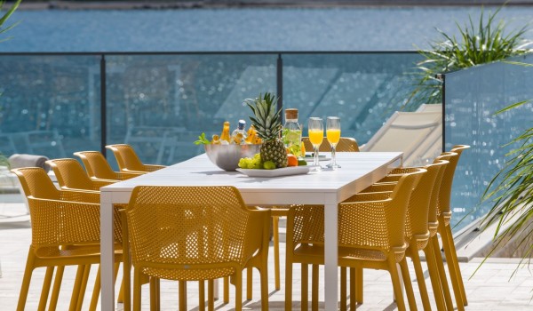 Хорватская арендуемая роскошная вилла Лапад в своем дворе содержит бассейн площадью 28 м2, шезлонги и обеденный стол на 10 человек.