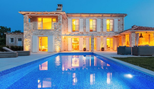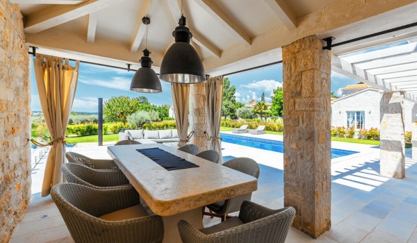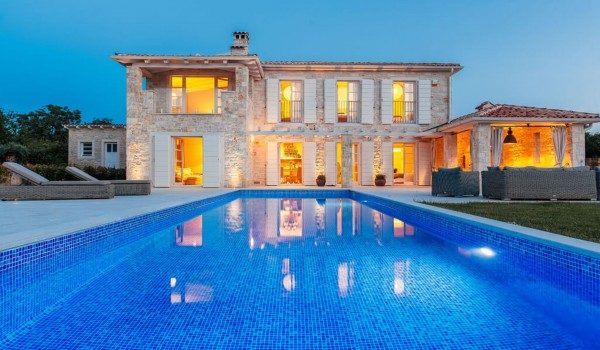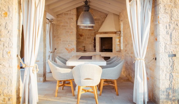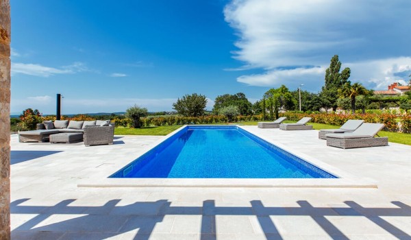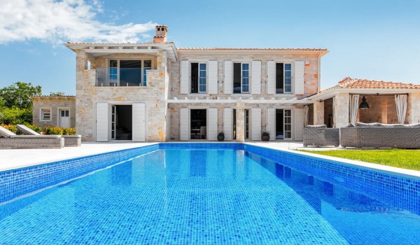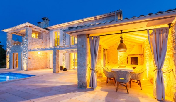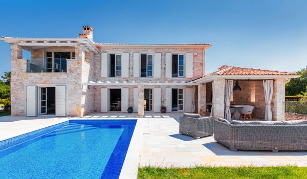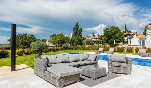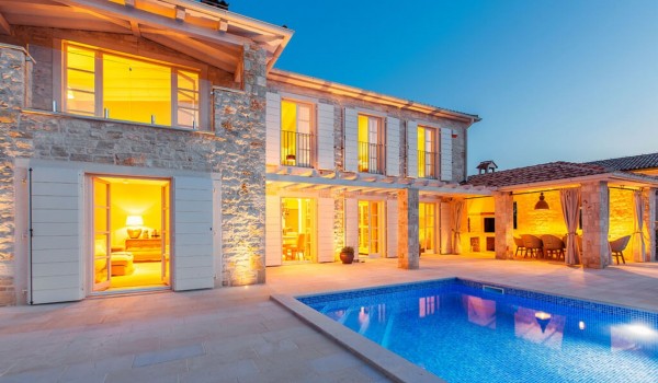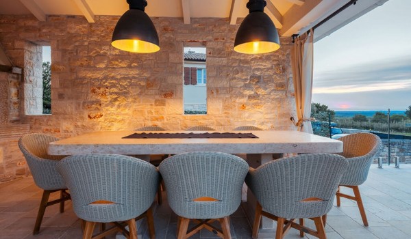 Роскошная вилла с 4 спальнями для семейного отдыха в Хорватии имеет частный бассейн площадью 63 м2 с шезлонгами и местом для отдыха, уличным душем, крытым уличным камином с раковиной и обеденной зоной с столом и стульями.