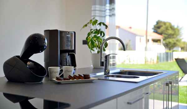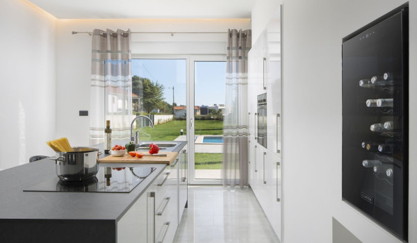 Кухня этой современной истрийской роскошной виллы с 4 спальнями оборудована посудой и стеклянными изделиями, плитой, духовкой, вытяжкой, посудомоечной машиной, холодильником, морозильником, винным холодильником, льдогенератором, тостером, чайником и кофеваркой.