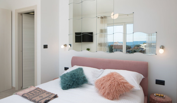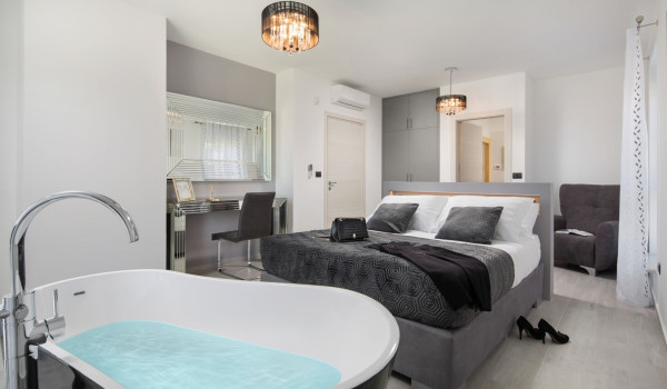 Первый этаж также соединен с вторым этажом лестницей, которая ведет вас в кондиционированную главную спальню с кроватью queen-size, SMART TV, интересной дизайнерской ванной для релаксации в пузырях и ванной комнатой с душем. То, что делает семейную виллу Kriya Medulin действительно особенной, - это главная комната на верхнем этаже роскошной виллы с выходом на прекрасную террасу, оборудованную джакузи и шезлонгами для полного и незабываемого отдыха с видом на прекрасное истрийское синее море.