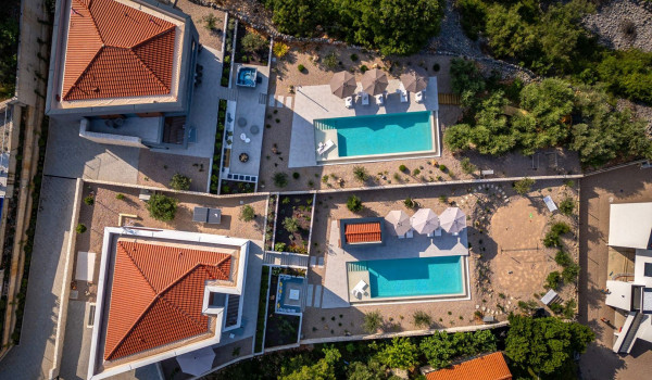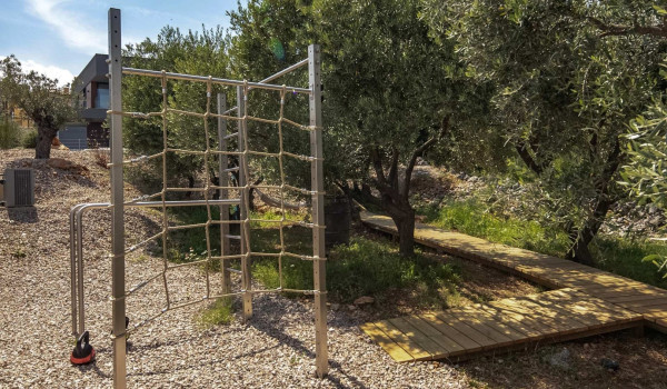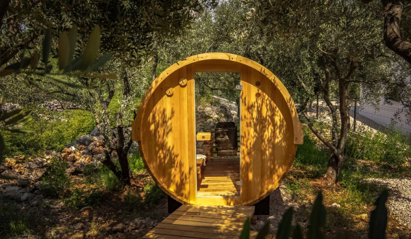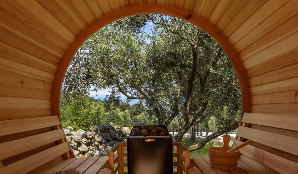 Большие стеклянные раздвижные двери соединяют внутреннее пространство виллы с внешней территорией этой роскошной семейной виллы в аренду в Хорватии и террасой с обогреваемым наружным бассейном площадью 50 м², 8 лежаками, наружной ванной и летней кухней с газовым грилем. Внутренний двор разделен на два уровня, при этом первый уровень включает внешнюю зону с сиденьем и столовой зоной, а также частный джакузи. Немного ниже находится обогреваемый частный бассейн, лежаки, зонты и наружный камин. Немного ниже, скрытая за оливковыми деревьями, расположена уникальная сауна в бочке, где можно расслабиться и насладиться, а также уличная фитнес-зона. Гостям также предоставляется SUP-доска и стол для настольного тенниса.