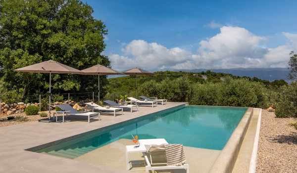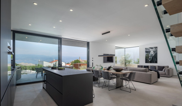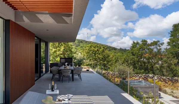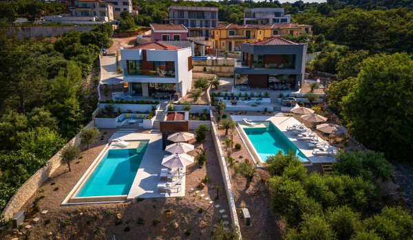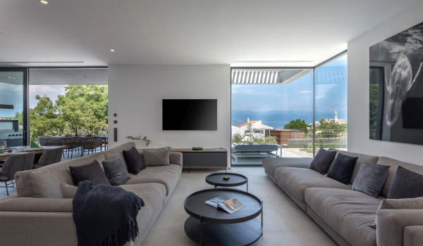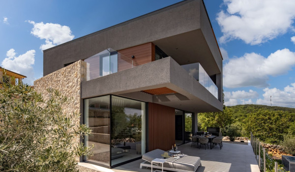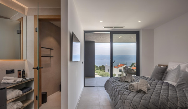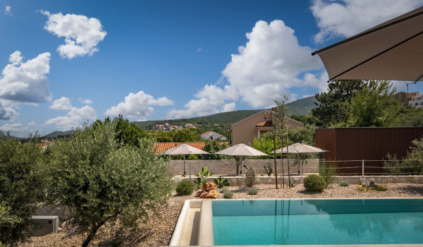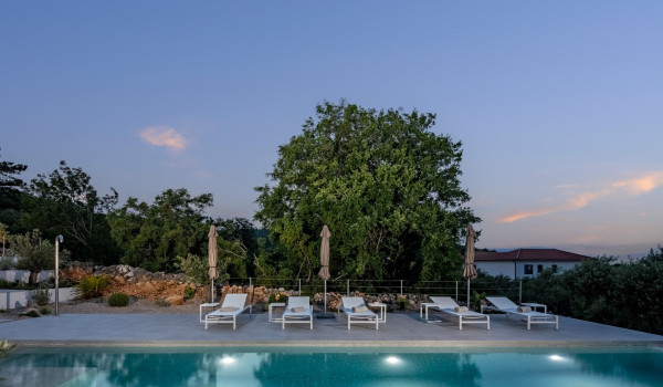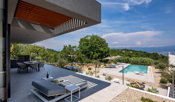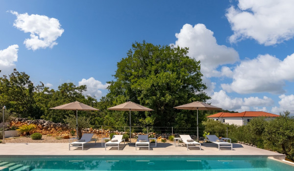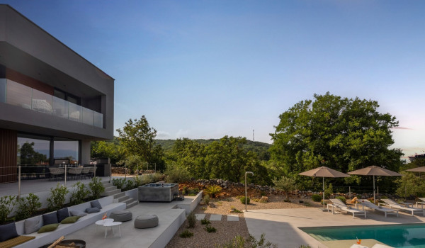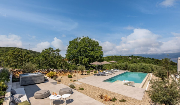 Хорватская люксовая вилла для аренды и отдыха Krk 1 Vrbnik предлагает роскошное жилье и современный дизайн на 200 м² жилой площади, распределенной на два этажа (цокольный и верхний этажи), а также участок площадью около 500 м². Вилла включает просторную гостиную, современно оснащенную кухню с кухонным островом и обеденной зоной, а также уличный гриль и очаг. Подогреваемый бассейн площадью 50 м² окружен 8 лежаками, душ на открытом воздухе, а немного дальше расположена фасса-сауна в оливковой роще и открытая тренажерная зона.