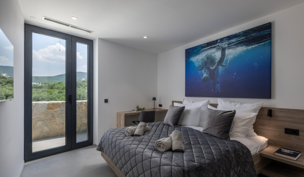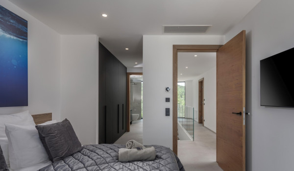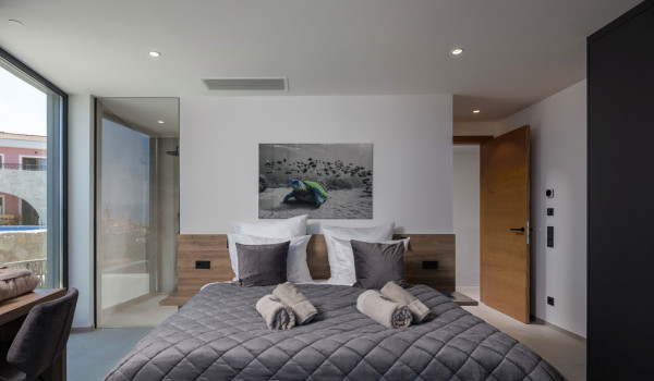 Вилла включает 3 кондиционируемые спальни с подогреваемыми полами, кроватями размера «king-size» и отдельными ванными комнатами с душем. Каждая спальня имеет балкон с прекрасным видом на море. Также имеется дополнительная спальня с односпальной кроватью и письменным столом, идеально подходящая для детей и подростков, так как в ней имеется поднятая двухъярусная кровать для одного человека.