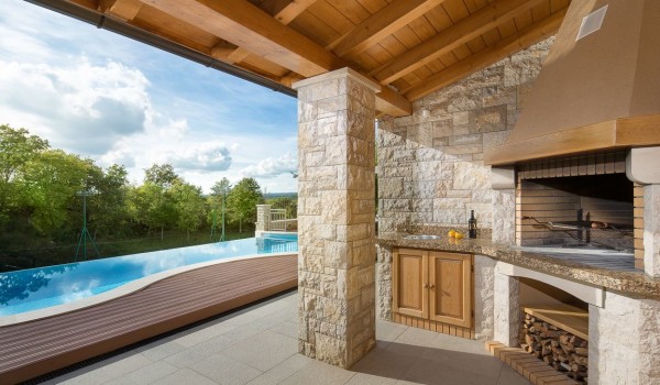 Роскошная вилла Labin Palace I с бассейном бесконечности - это дом для отдыха, расположенный на красивой территории с каменной тропой, украшенной древним славянским письмом - глаголицей. По этой тропе можно дойти до ухоженной террасы, где находится бассейн бесконечности, окруженный шезлонгами для загара и уличным душем. Здесь также есть уютная зона для отдыха, идеальная для утреннего кофе под сенью столетнего дуба и с прекрасным видом на окружающую природу. Рядом с бассейном есть крытая терраса с большим столом на 10 человек, раковиной и каменным грилем, на котором можно готовить разнообразные гастрономические изыски, за которыми славится Истрия.