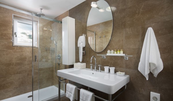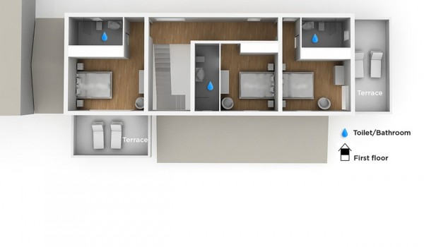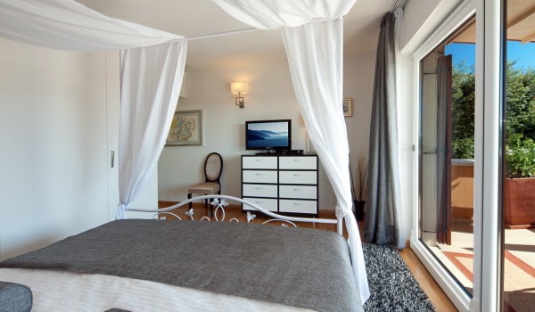 По лестнице вы поднимаетесь на второй этаж виллы для аренды, где расположены оставшиеся 3 спальни. Все комнаты оборудованы кроватями king size и собственными ванными комнатами с душем. Две из них также имеют собственные крытые террасы (18 м2) с креслами и кофейным столиком. Все комнаты в частной вилле оборудованы телевизорами, кондиционерами, сейфами, центральным отоплением, и все ванные комнаты имеют подогрев пола.