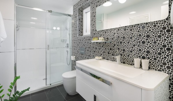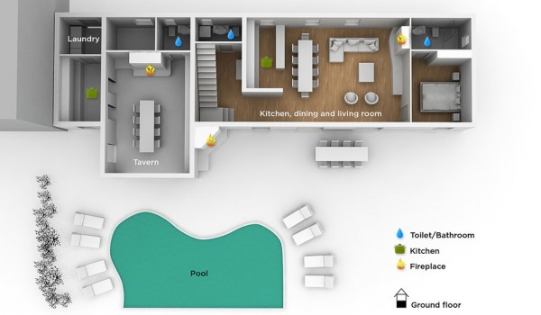 С террасы можно попасть в открытое пространство первого этажа виллы, которое включает в себя просторную гостиную с большим удобным диваном, ЖК-телевизором и камином. Гостям также доступна игровая консоль PlayStation. Здесь также находится полностью оборудованная кухня с барной стойкой и столовая с массивным деревянным столом на 10 человек. Весь интерьер выполнен в утонченной элегантности с нежными оттенками, подчеркивающими тепло и комфорт всей виллы. На первом этаже также расположена одна из 4 спален. Эта комната оснащена кроватью king size и собственной ванной комнатой с душем и полом с подогревом. На этом этаже также есть дополнительный туалет с стиральной машиной и сушилкой.