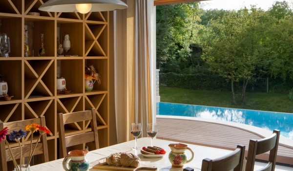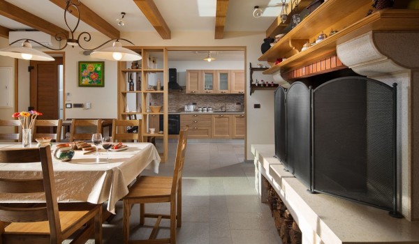 На первом этаже дома для отдыха также есть погреб с местом для приготовления барбекю, который открывается наружу на террасу. Погреб идеален для встреч с близкими за бокалом хорошего вина. В погребе есть большой обеденный стол на 12 человек, а также телевизор, кондиционер и центральное отопление. Сразу рядом находится гостевой туалет и еще одна полностью оборудованная кухня.