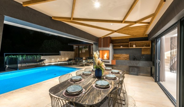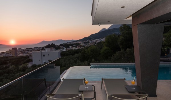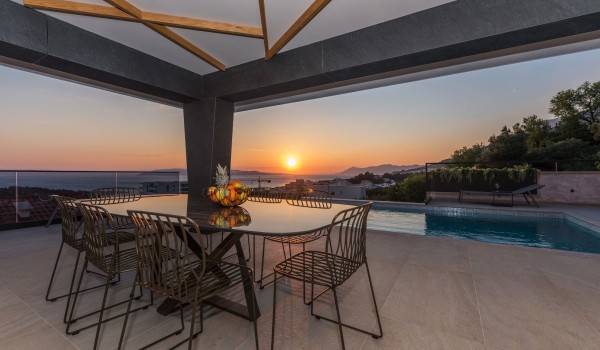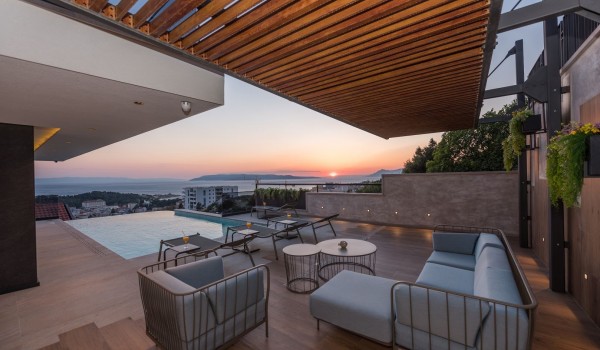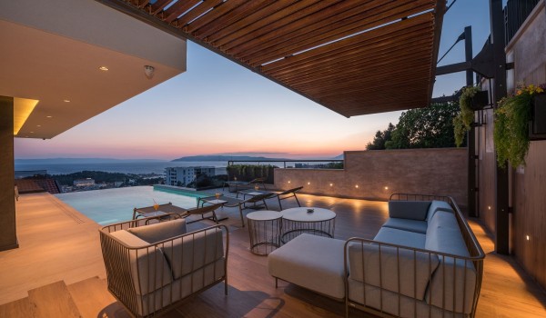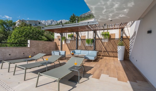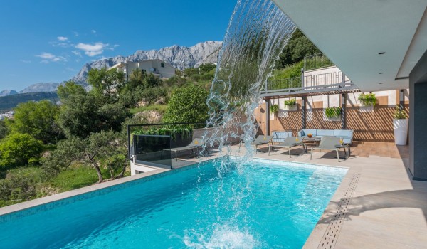 Прибыв на территорию этой впечатляющей современно оформленной квартиры в Хорватии, первое, что захватывает дух, - это великолепный панорамный вид, с одной стороны на город Макарска и его окрестности, а с другой стороны на могучую гору Биоково, которая охраняет всю Макарскую Ривьеру. На просторной современной мощеной террасе расположен большой подогреваемый бесконечный бассейн с впечатляющим видом на море и Макарску. Рядом с бассейном удобные шезлонги и летняя кухня на свежем воздухе с камином и обеденным столом на 8 человек, идеально подходящим для общения и наслаждения вечером с чудесным видом на закат. Кроме того, здесь также есть открытая зона для отдыха с небольшим столиком. Террасу окружает стеклянный забор, чтобы вид с нее оставался как можно более неприкосновенным.