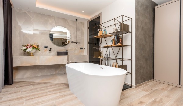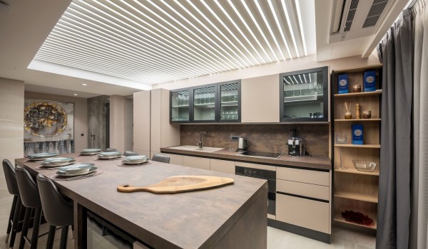 Интерьер этого пространства доминируют нейтральные, светлые цвета, которые придают этому современному этажу некоторую теплоту, но и утонченность. Впечатление усиливается большими потолочными светильниками, которые находятся над кухней и островом, и освещают всё пространство. На этом этаже также есть одна общая ванная комната, расположенная рядом с лифтом, что облегчает передвижение гостей по этой просторной вилле с бассейном.