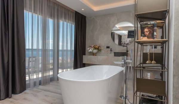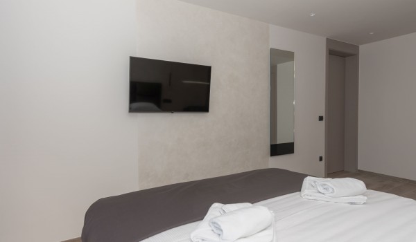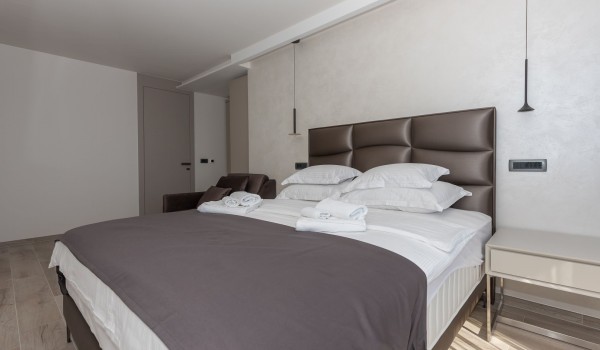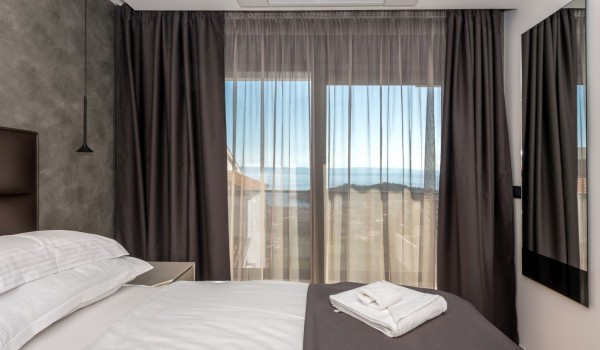 Белая винтовая лестница ведет на второй этаж этой великолепной виллы с видом на море, где расположены четыре спальни с ванными комнатами. Комнаты также современно оформлены, с ЖК-телевизором и большими окнами, которые позволяют неограниченному виду на нетронутое море и город Макарска. Из-за такого большого количества больших окон комнаты также пронизаны большим количеством дневного света, именно поэтому, в сочетании с минималистичным декором и простыми цветами интерьера, они кажутся еще более просторными. В одной из спален, помимо современной ванны, есть также большая ванна, из которой гости могут наблюдать за нетронутым морем. В интерьере собственной ванны также преобладают базовые цвета, что способствует роскошному внешнему виду. Они оформлены мраморными плитками и оснащены душем с дождевым струей, большими зеркалами, раковинами и всеми необходимыми туалетными принадлежностями.