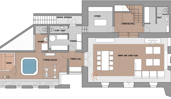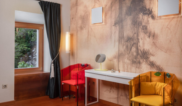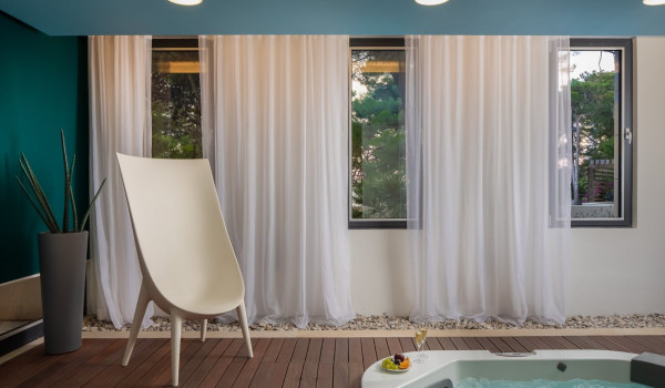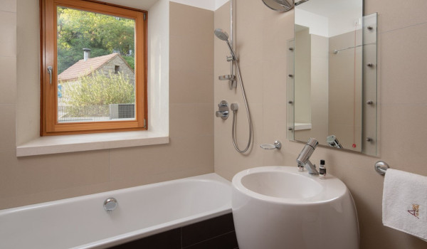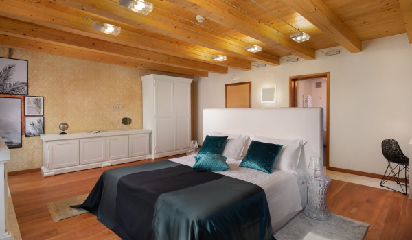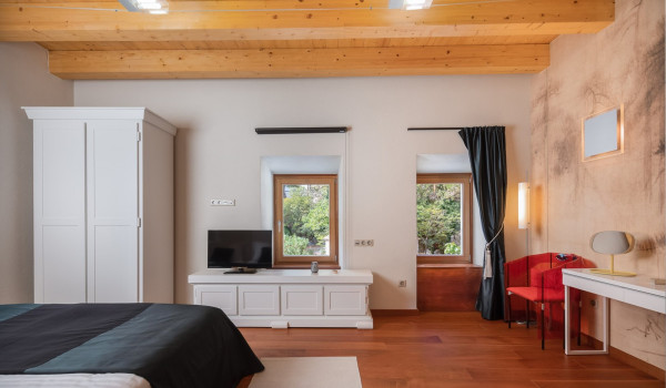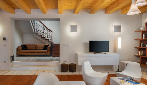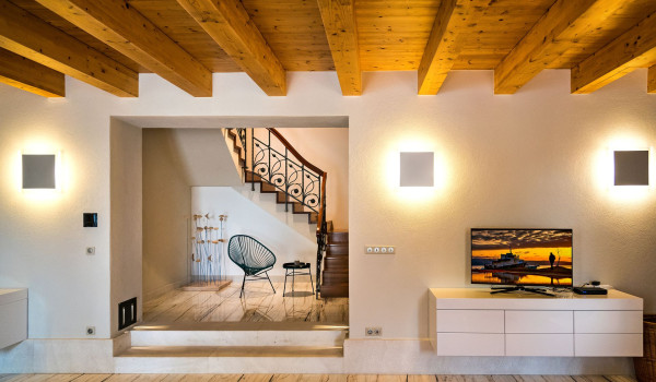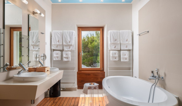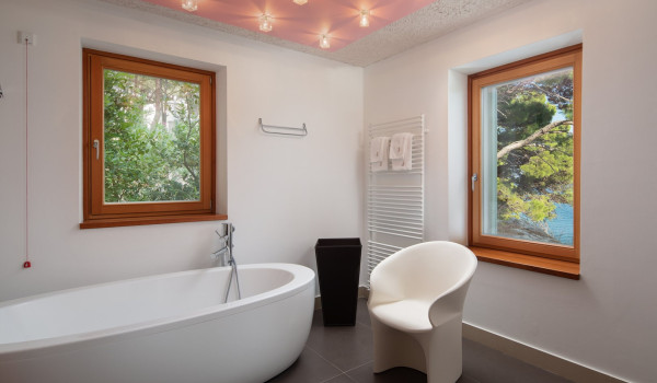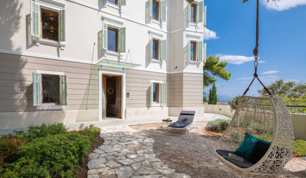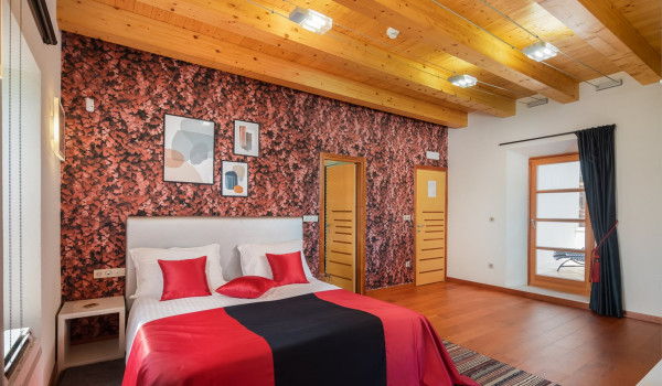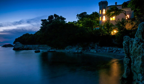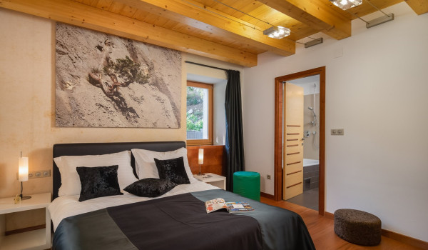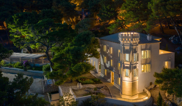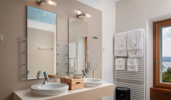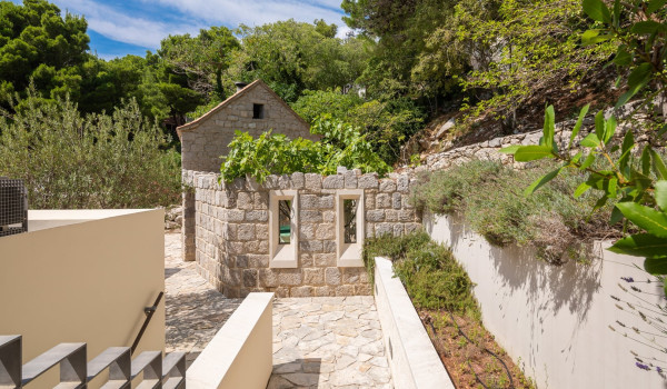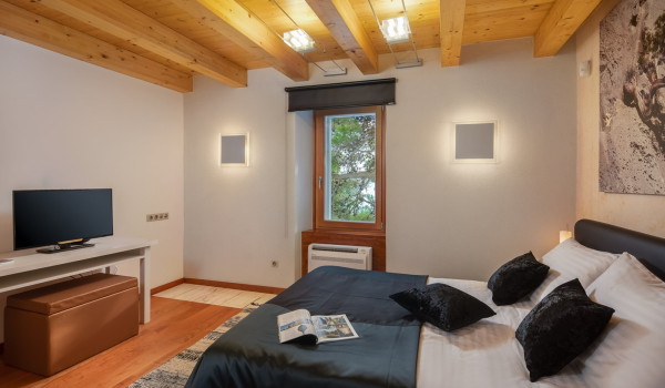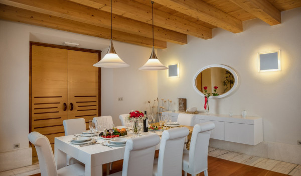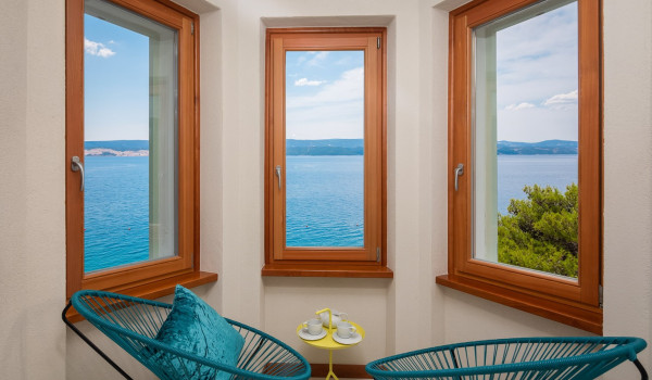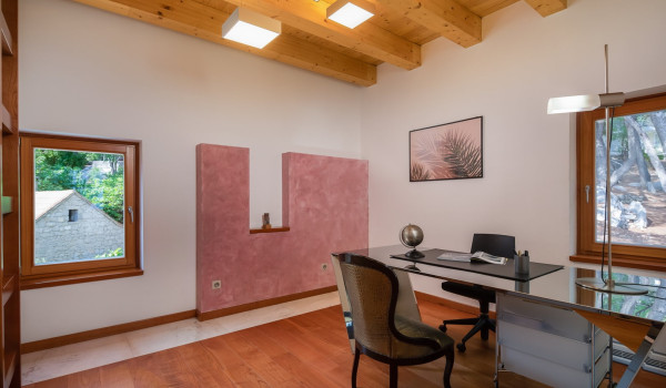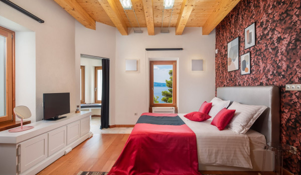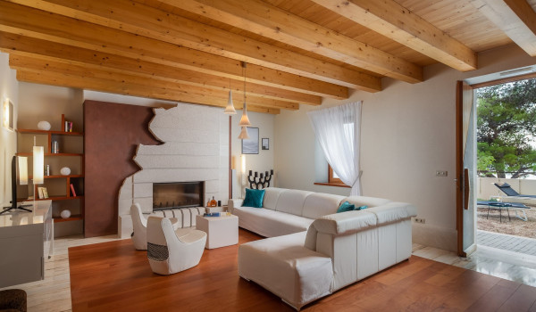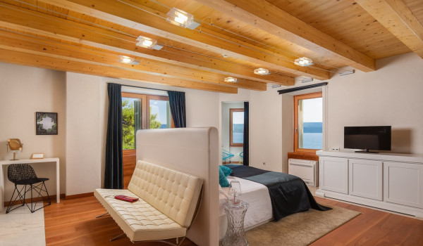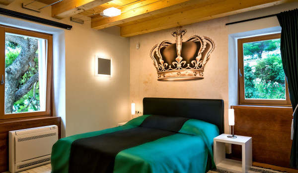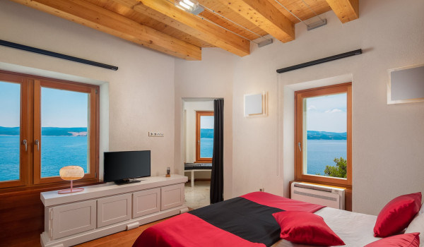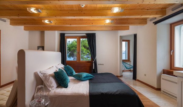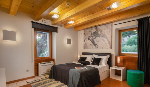 С террасы вы попадаете в тщательно продуманную гостиную с удобными диванами, ЖК-телевизором, камином и обеденным столом на 8 человек. На этом этаже расположена полностью оснащённая профессиональная кухня: на ней гости могут приготовить вкусные далматинские блюда; здесь также есть гостевой туалет с душем. Для полного наслаждения и релаксации гостям доступен велнес-оазис с джакузи, сауной, тренажёрным залом и ванной комнатой с душем.Лестница ведёт нас на первый этаж с двумя спальнями: в главной спальне king size кровать, диван и примыкающая ванная комната с ванной. Главная спальня имеет аутентичную башню с прекрасным видом на море. Во второй спальне на этом этаже queen size кровать и ванная комната с ванной. Обе спальни с кондиционерами и ЖК-телевизорами со спутниковыми каналами.