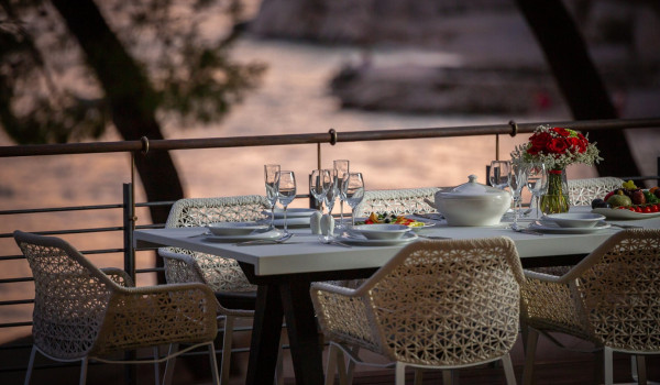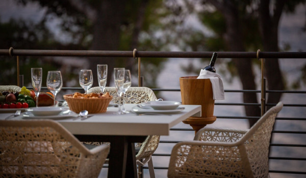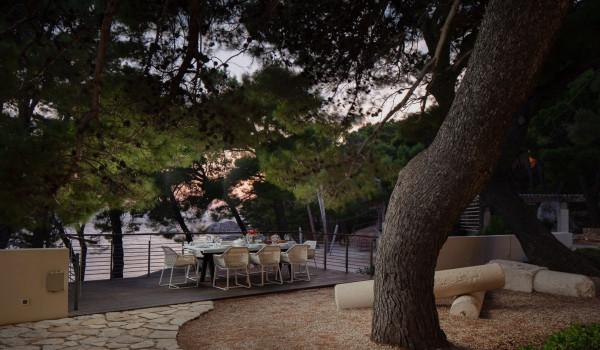 Внешний вид роскошной виллы Sea Palace с бассейном рядом с пляжем простирается на несколько этажей, от самого галечного пляжа до входа в эту виллу для отдыха Sea Palace. Гости имеют доступ к бассейну, а по лестнице можно подняться на плато, где стоит большой обеденный стол на 8 человек.