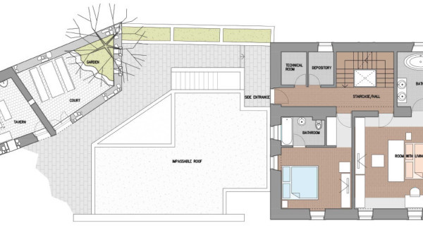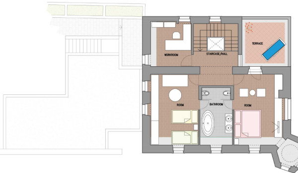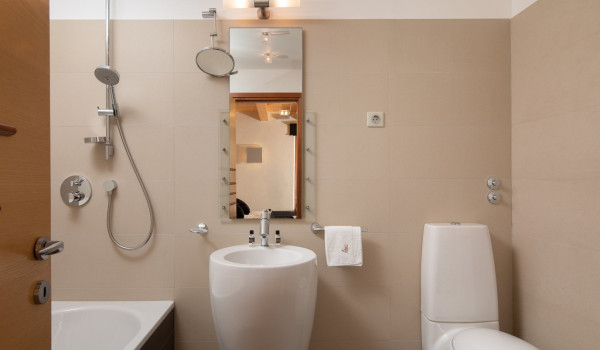 Лестница ведёт нас дальше на второй этаж; здесь вы найдете две спальни с общей ванной комнатой с ванной. В первой спальне queen size кровать, аутентичная башня и красивая терраса с видом на море. В последней спальне 2 односпальные сдвигающиеся и раздвигающиеся кровати. На этом этаже также есть домашний офис. Обе спальни с кондиционерами и ЖК-телевизорами со спутниковыми каналами.