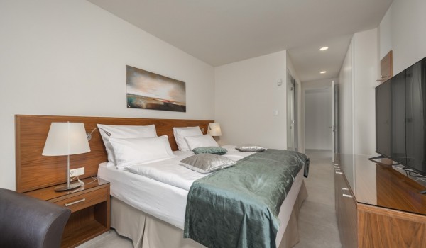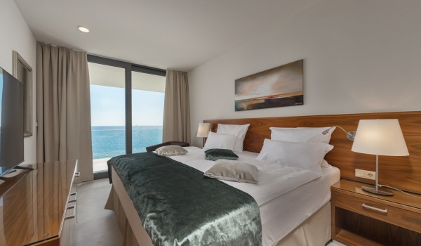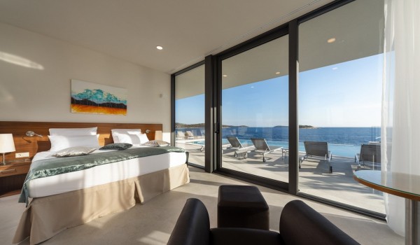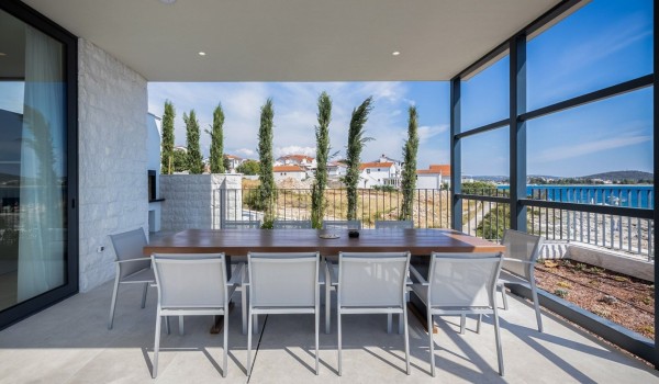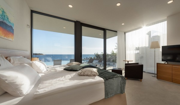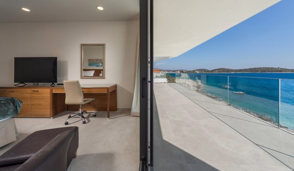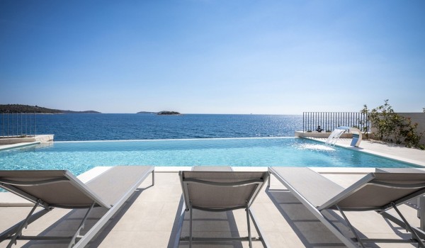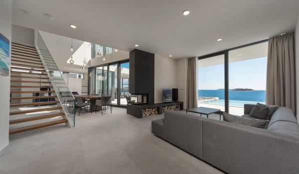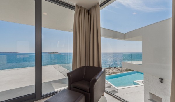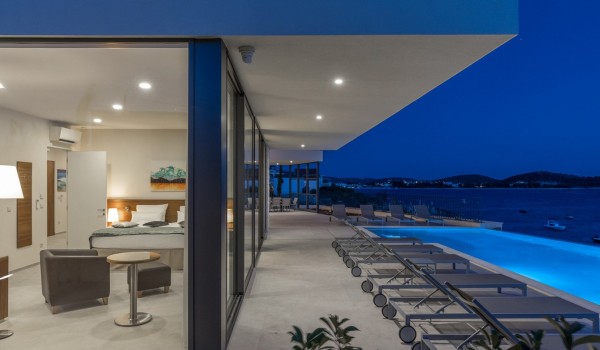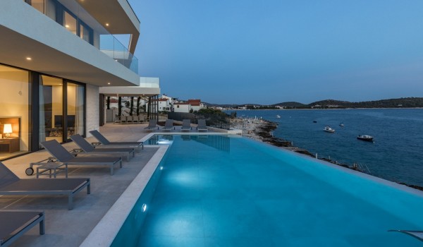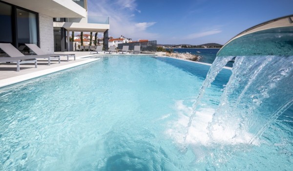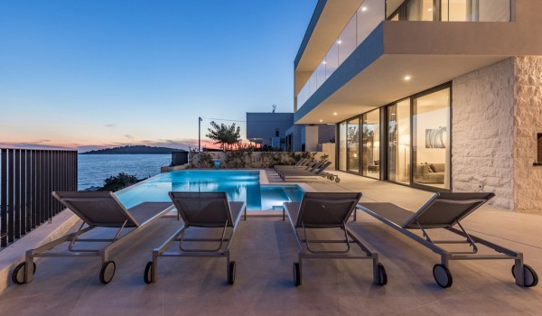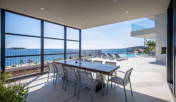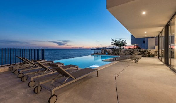 Впечатляющий дизайн и роскошная обстановка – первое, что бросается в глаза, когда вы входите на эту современную красавицу, дарящую удовольствие. Эта вилла у моря окружена тщательно спроектированной террасой, на переднем плане которой находится гидромассажный подогреваемый инфинити бассейн площадью 55 м2 с водопадом и морской водой в окружении удобных шезлонгов. Рядом есть также летний душ, обеденный стол под навесом на 10 человек и гриль. Эта терраса является идеальным оазисом уединения, здесь можно понежиться в лучах средиземноморского солнца во второй половине дня и вместе приготовить местные деликатесы, наблюдая за горизонтом Адриатического моря.