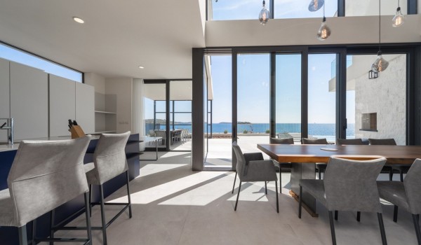 Стеклянные стены, через которые проникает максимальное количество света, отделяют жилое пространство роскошной виллы, где разрешено размещение с домашними животными, на берегу моря. На цокольном этаже, как и в спальнях, из каждой комнаты открывается вид на террасу и море. Нейтральные тона, преобладающие на вилле, создают ощущение простоты, чистоты и утонченности. На цокольном этаже находится полностью оснащённая кухня SieMatic с кухонным островом и барными стульями, обеденный стол на 10 человек и гостиная с удобным угловым диваном, спутниковым ЖК-телевизором и камином, приглашающими вас остаться и расслабиться.