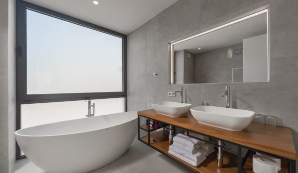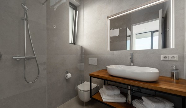 Гардероб, прачечная, дополнительный туалет и первая спальня с примыкающей ванной комнатой с душевой кабиной также расположены на цокольном этаже роскошной виллы в аренду. Эта спальня адаптирована для людей с ограниченными возможностями, в ней есть двуспальная кровать и отдельный выход к бассейну с подогревом.