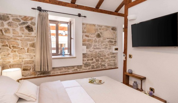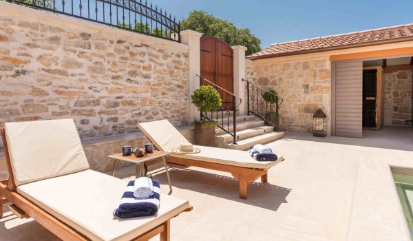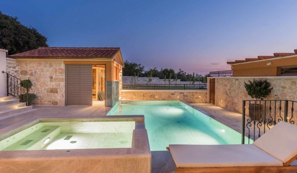 Открытая терраса роскошной виллы Finessa Skradin 2 оборудована частным подогреваемым бассейном площадью 32 м2 и гидромассажной джакузи, окруженными удобными шезлонгами под навесом. Терраса окружена зеленью нетронутой средиземноморской флоры. Рядом с бассейном находится крытая летняя беседка с летней кухней, камином и обеденным столом. Сауна для полной релаксации находится всего в нескольких шагах от бассейна. Эта каменная красота оборудована гостиной, в которой диван-кровать может служить дополнительной кроватью для детей, полностью оборудованной кухней и обеденной зоной, которые сливаются в открытом плане.